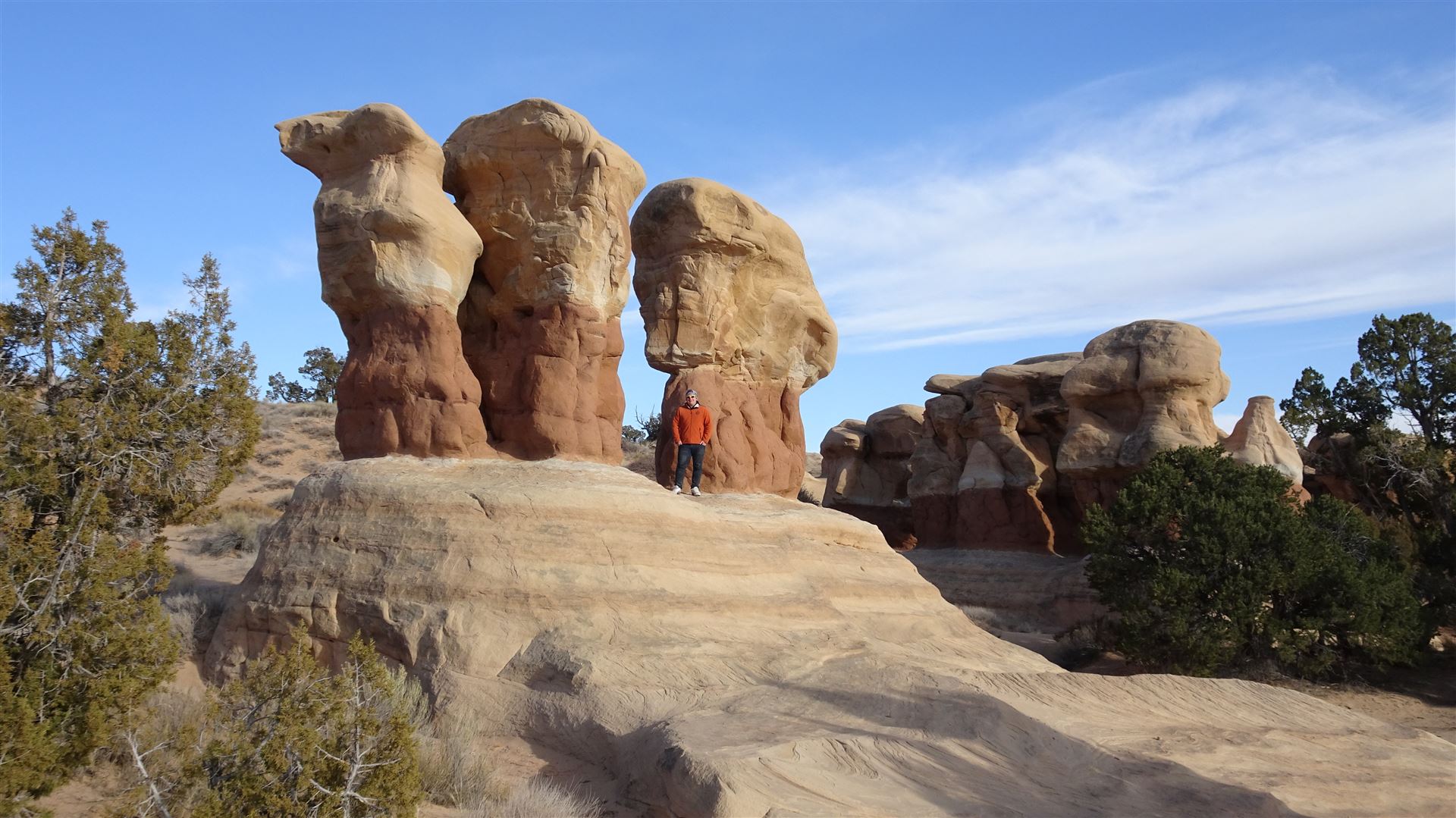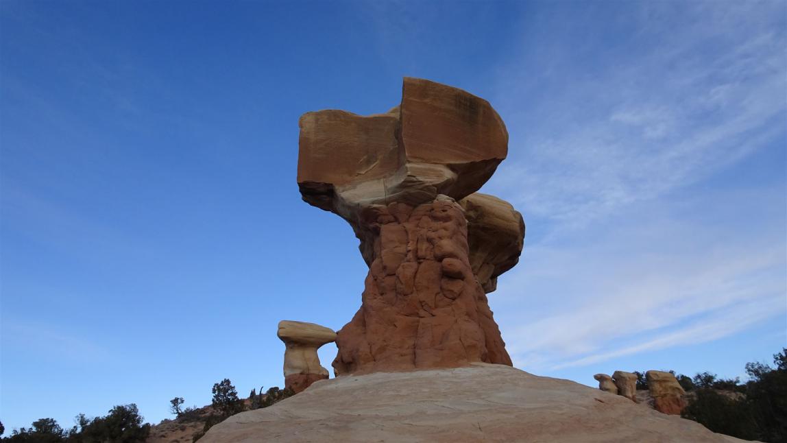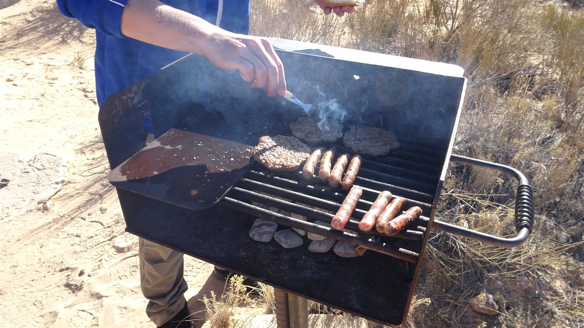 Auf dem Rückweg waren wir alle drei richtig euphorisiert. Wir redeten und redeten, bis wir am Ende der Wanderung wieder vor unserem Auto standen. Die Zeit verging wie im Flug, trotz der fast 5 Stunden auf Achse. Aber natürlich war noch nicht der Tag zu Ende. Wir hatten Hunger und heute wollten wir, wie echte Männer das so machen, unser Fleisch über dem selbst entfachten Feuer braten. Wir fuhren die Hole in the Rock Road bis zum Devils Garden und nahmen einen der dort vorhandenen Grills in Beschlag.