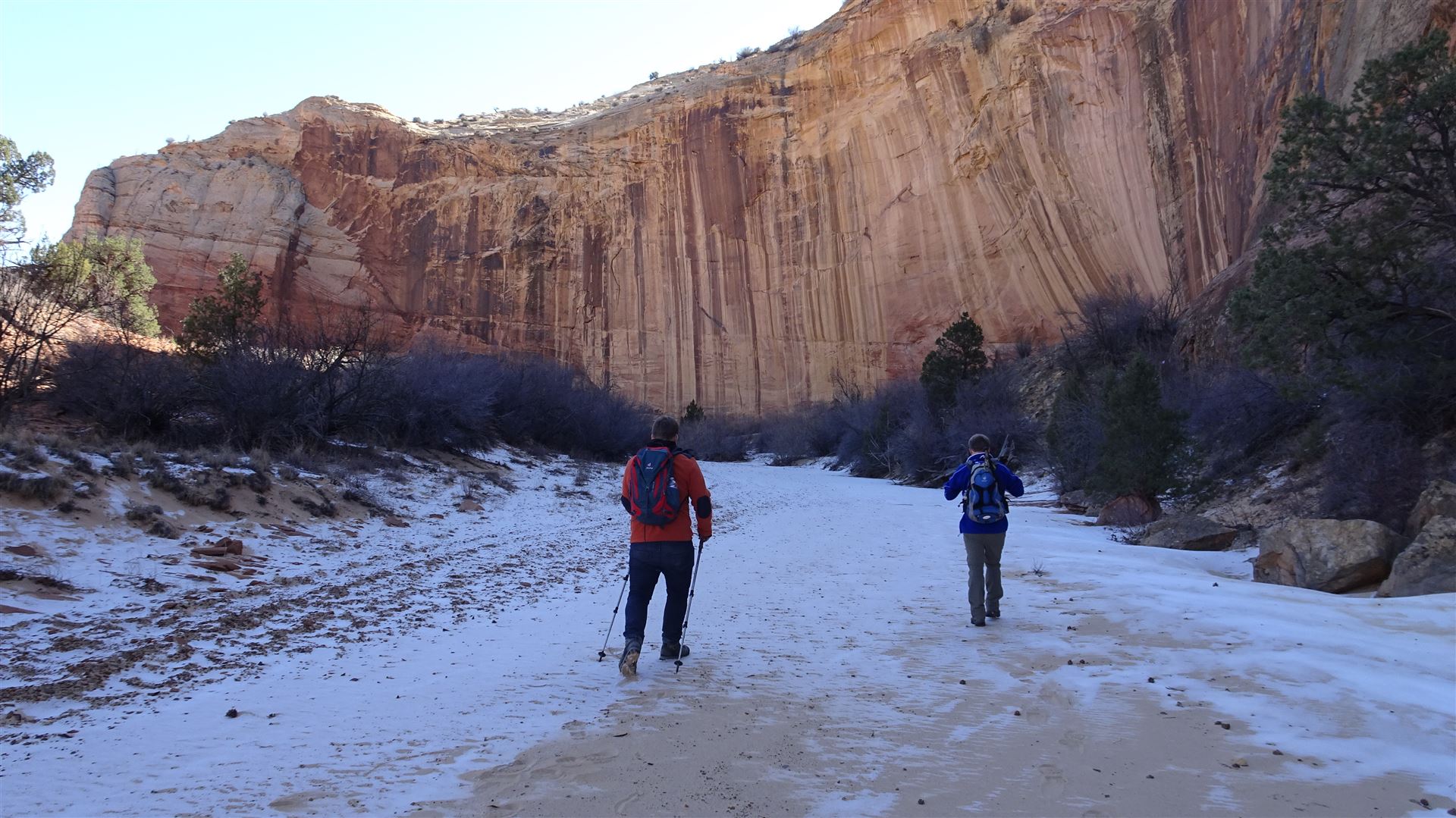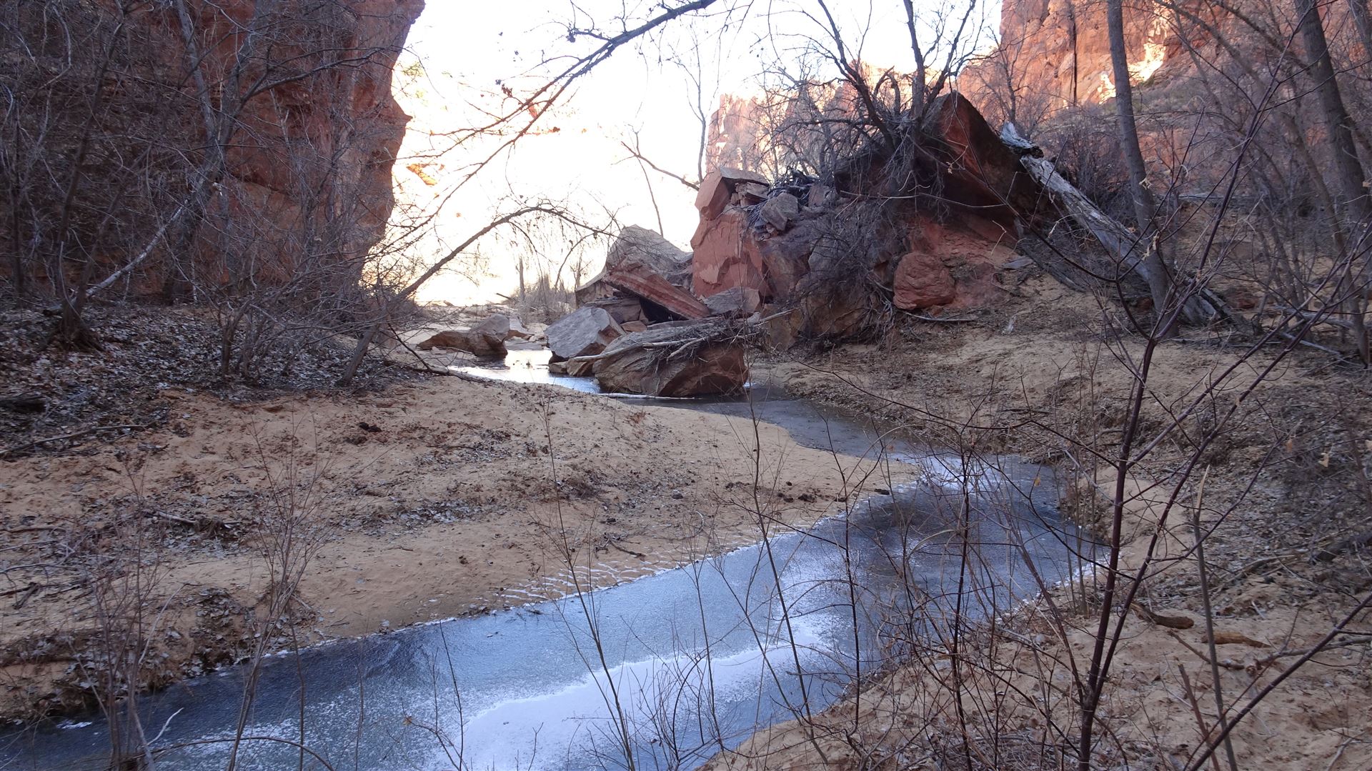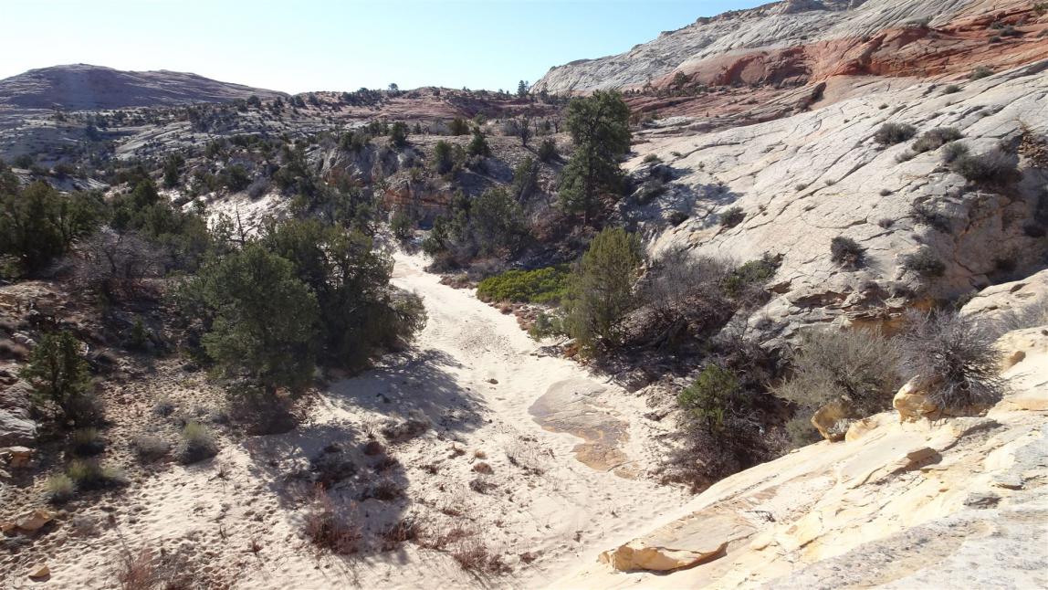 Als ich gestern die Wegbeschreibung las, hatte ich gedacht, es würde stärker den Berg abwärts gehen als es dann tatsächlich der Fall war. Ich hatte ein wenig Respekt vor dem Gang zurück. War aber dann tatsächlich halb so schlimm. Natürlich hilft im Februar die Wetter- und Temperatursituation. Heute Morgen betrugen die Temperaturen kaum mehr als 0 Grad C. Im Phipps Wash selber lag sogar noch ein wenig Schnee.