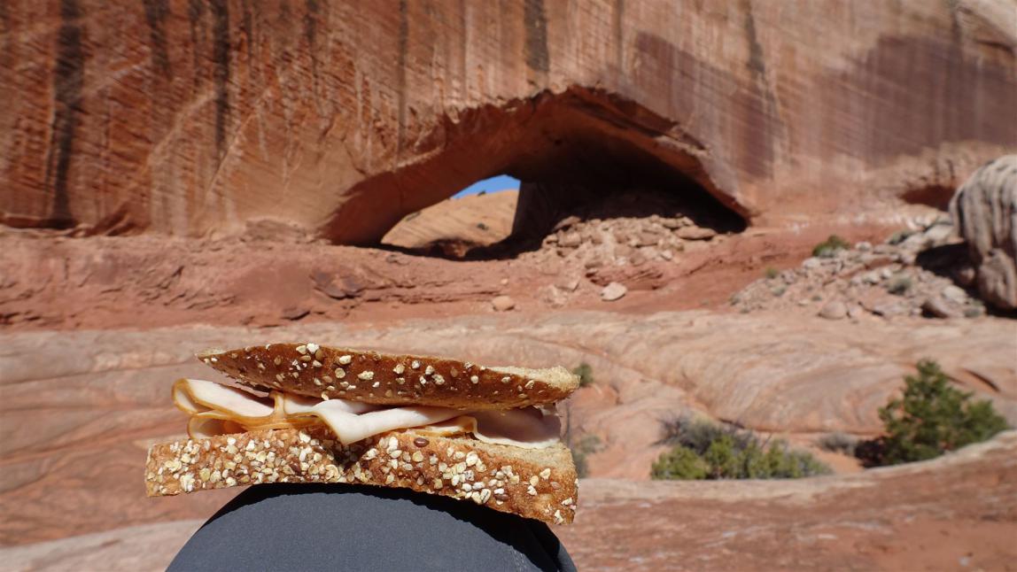 Oben am Phipps Arch angekommen machten wir zunächst einmal das was wir immer machen. Ihr ahnt es bereits, wir hatten wieder einmal unser Vesper dabei. Ohne jetzt meckern zu wollen, muss ich allerdings zugeben, so ganz lecker ist unser Vesper hier tatsächlich nicht. Das labbrige Brot, was es hier gibt in Kombination mit der Wurst, ist nach meinem Geschmack nur mit sehr viel Senf zu genießen. Im Escalante Shop gab es aber heute Morgen leider kein anderes Brot. Mussten wir uns also damit abfinden. Nicht das wir verwöhnt wären, aber auch diese Tatsache muss man einmal erwähnen. Mittlerweile gibt es z.B. im Walmart ein ganz annehmbares Ciabatta, welches sogar bröselt beim abreißen und auch geschmacklich durchaus akzeptabel bis sehr gut ist.