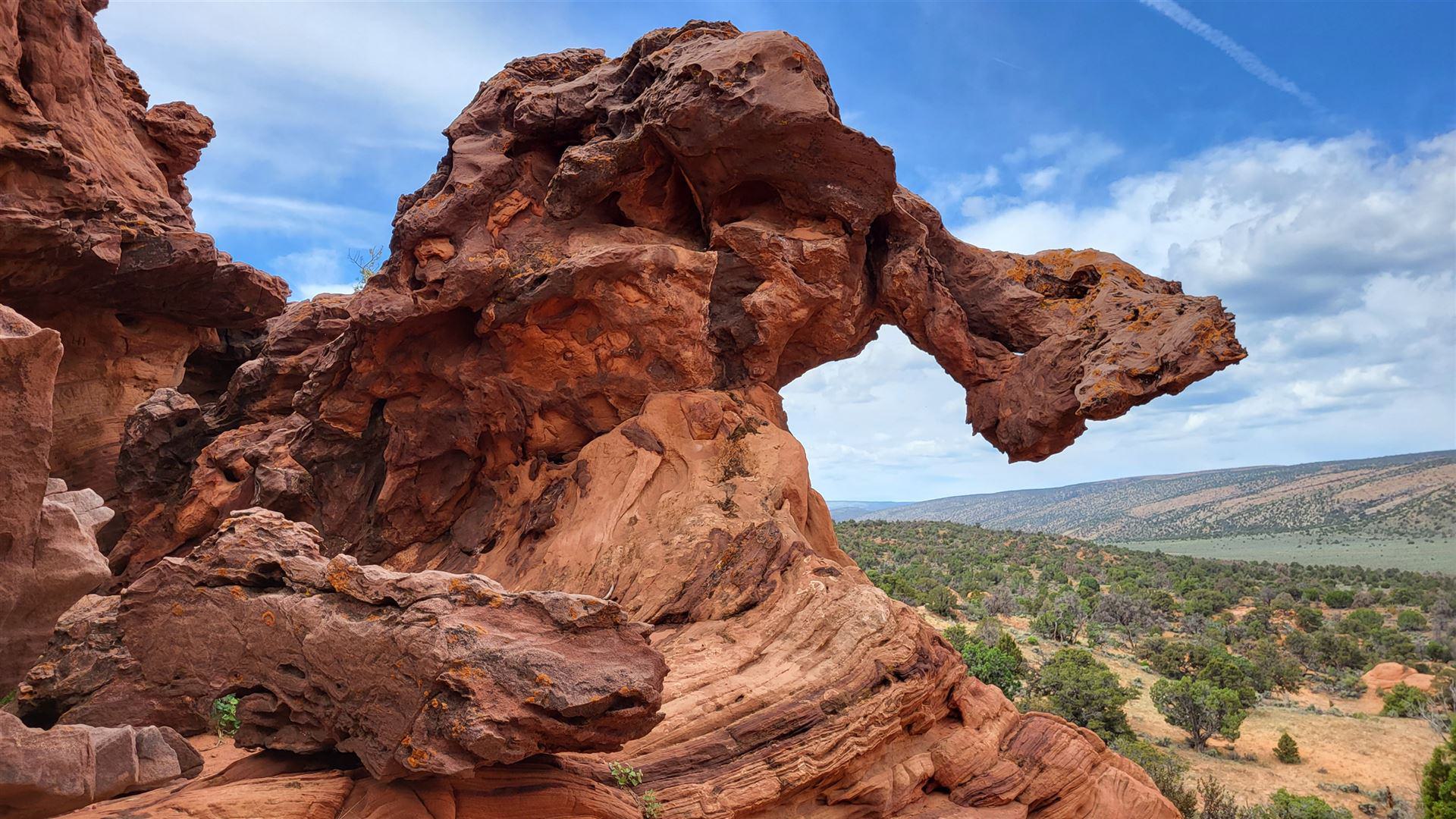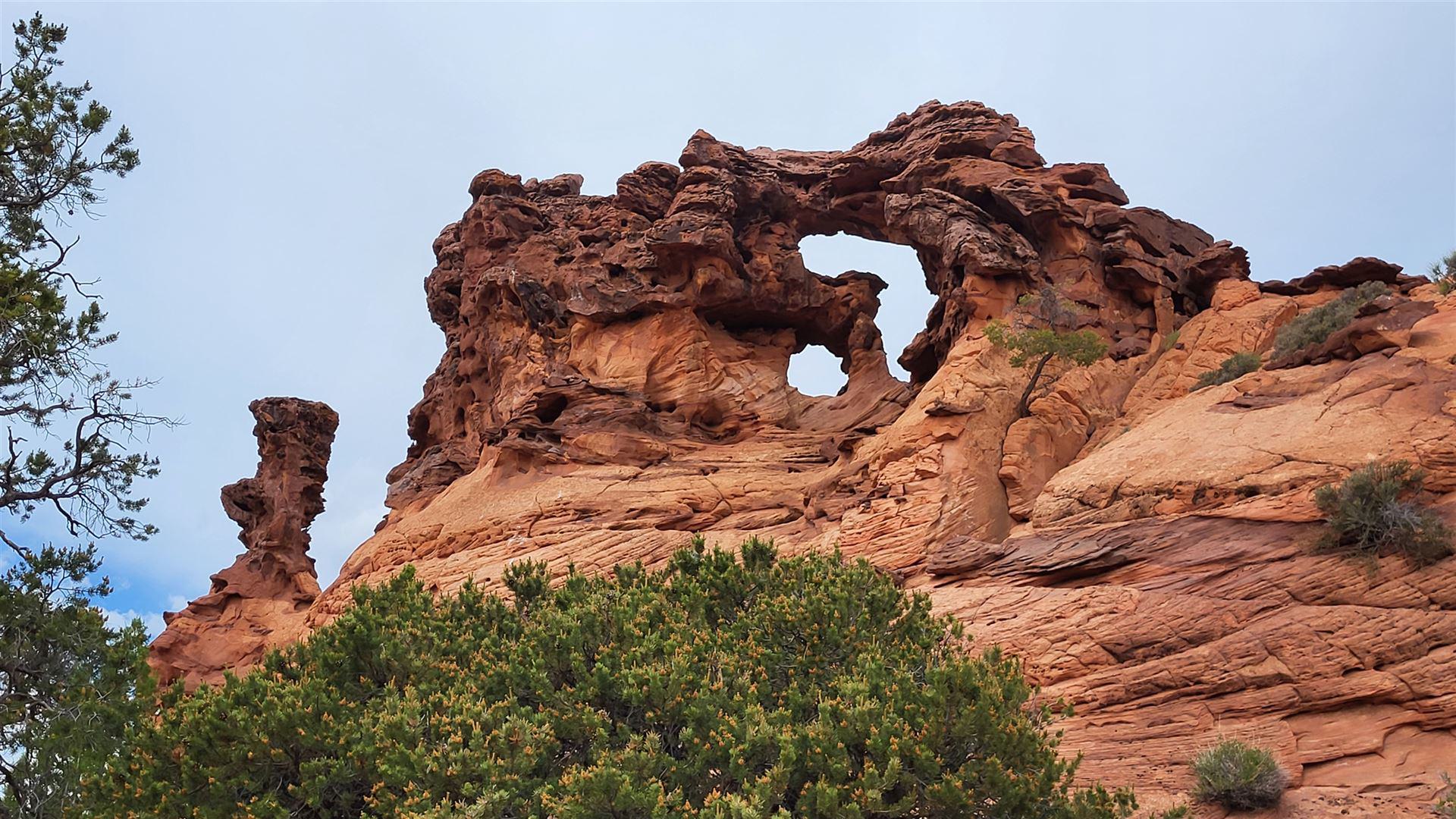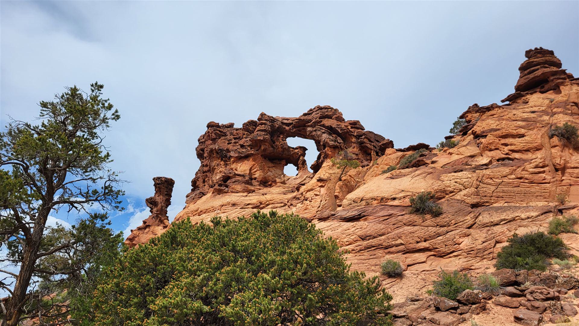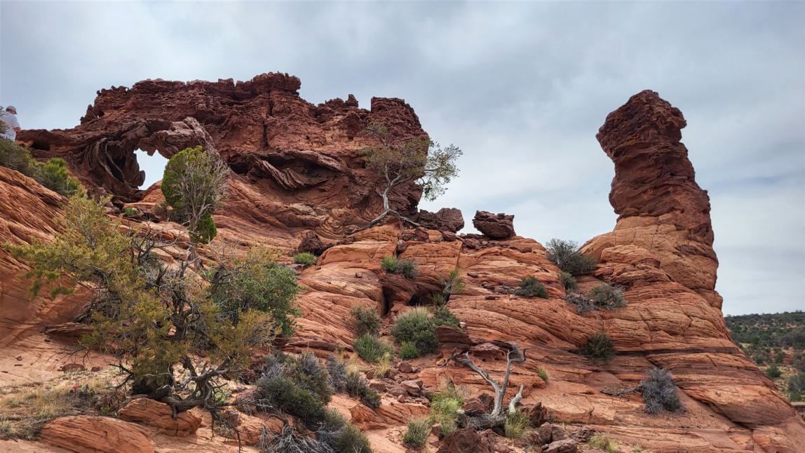 Wir haben einen uns bis dato völlig unbekannten Arch gefunden. Offiziell als Double Barrel Arch in der Topo Map meines Gaiagps verzeichnet, hat uns der Name aber nicht so gefallen und wir haben ihn schlicht und ergreifend Jim Knopf Arch genannt. Von der House Rock Valley Road aus sah er nämlich genau wie die legendäre Lokomotive von Jim Knopf aus. Man hätte natürlich auch Emma-Arch sagen können, denn so hieß die Lok von Lukas, der wiederum der Lokomotivführer war. Viele Namen, uns fiel halt nur Jim Knopf ein. Musste reichen.